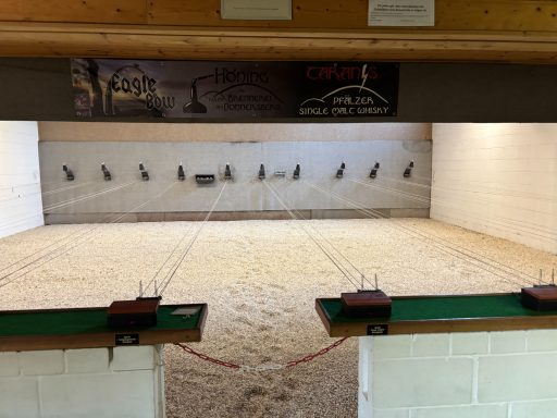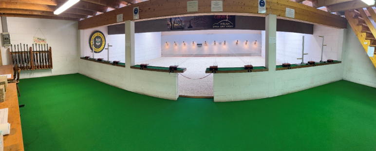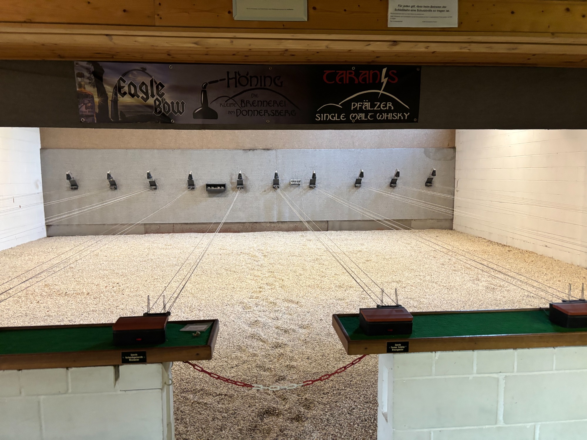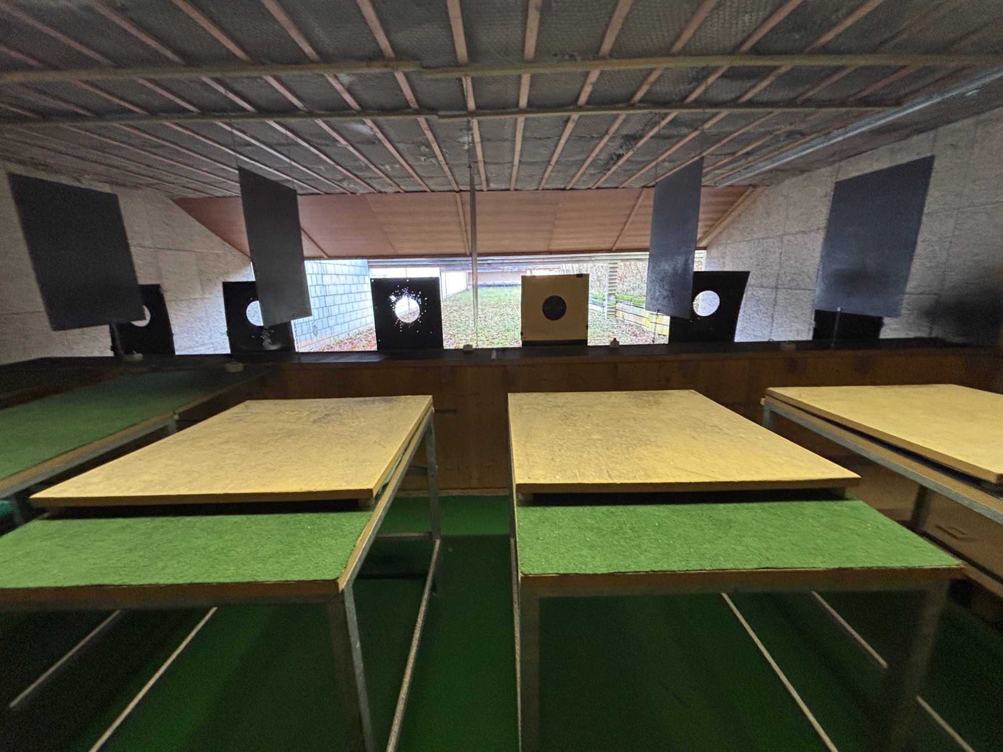 Mit 10 Pistolenständen 25 Meter und 3 Kleinkaliber Ständen mit 50 Meter Bahnen und 2 Aufenthaltsräumen mit Stromversorgung aus dem Keller mittels eines Stromaggregats.